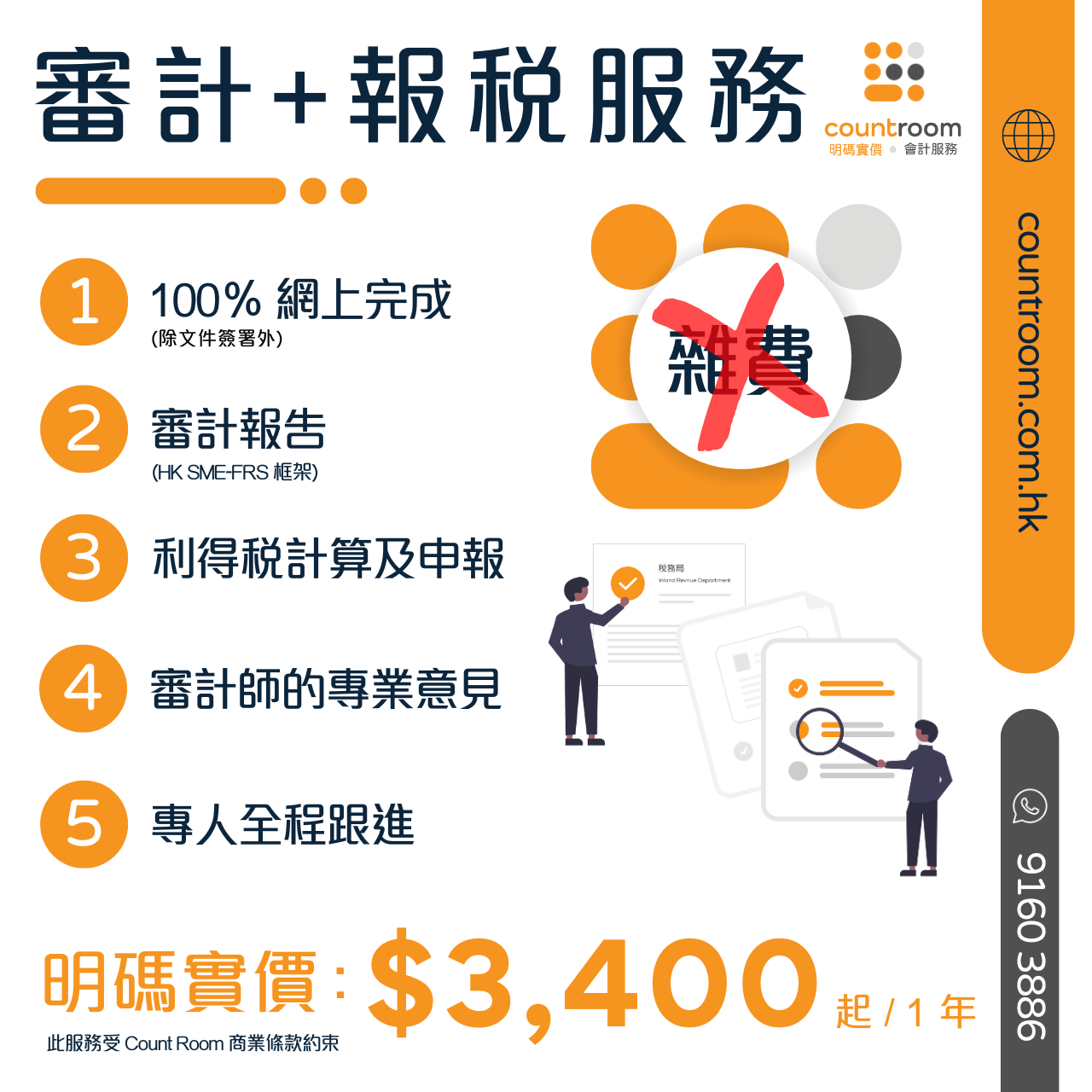 Count Room 提供一條龍「會計 + 審計 + 報稅」服務,讓您輕鬆無憂,專心做生意!